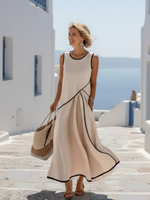 This dress features a flowing maxi length with a soft round neckline and a sleeveless design. The fabric has a smooth, lightweight drape that allows the skirt to move easily while remaining comfortable throughout the day. A gathered side detail adds gentle shaping while keeping the overall silhouette relaxed and easy to wear.